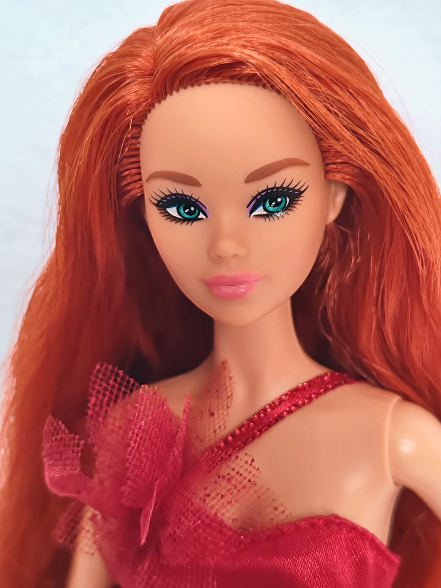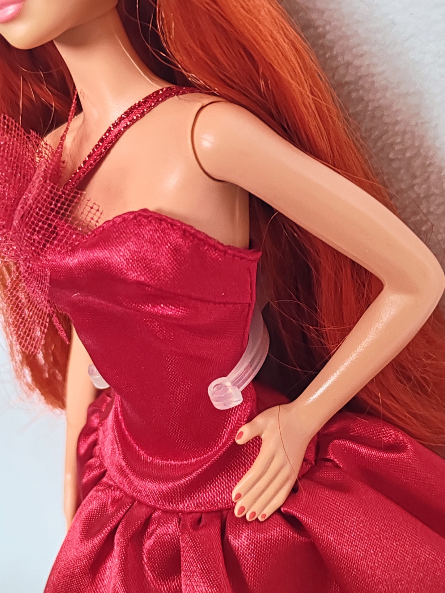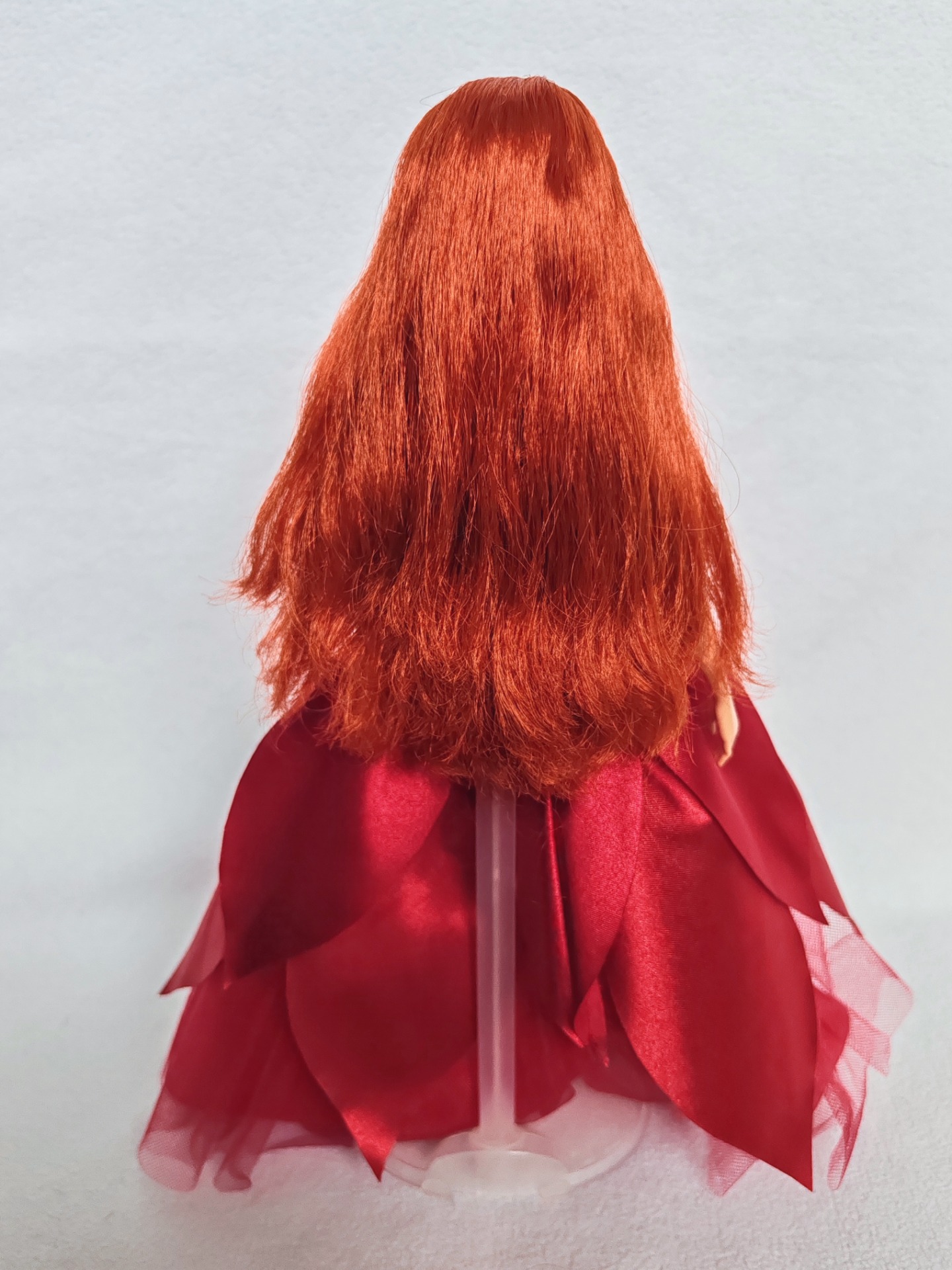 Narovnané vlasy, pouze vystavená ve vitríně. Vlasy jsou plně bez gelu či laku.