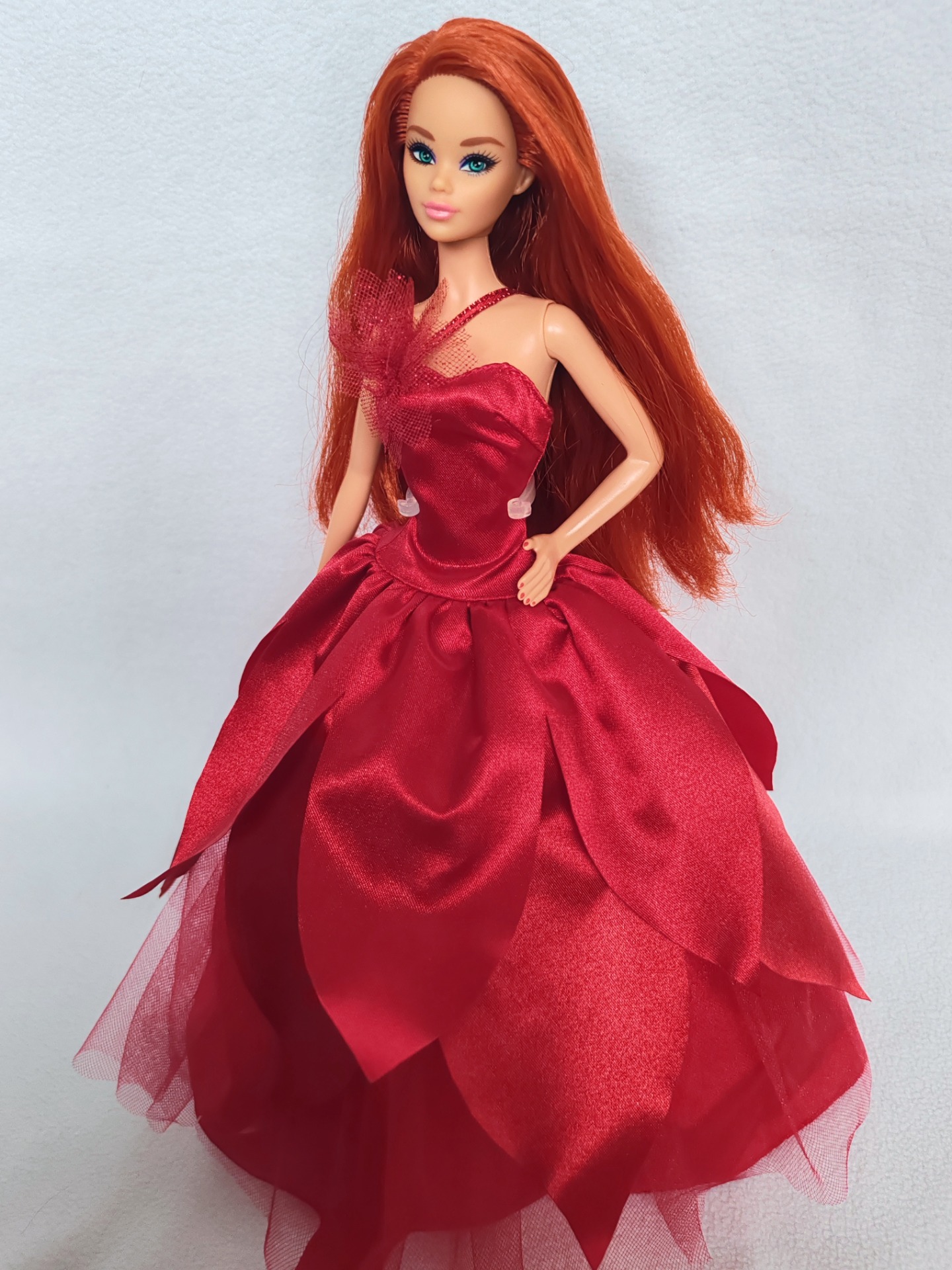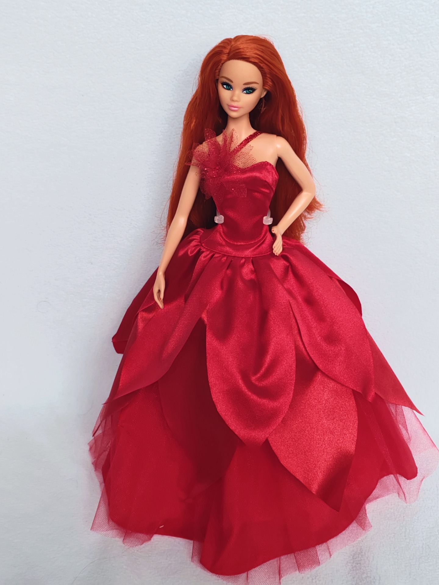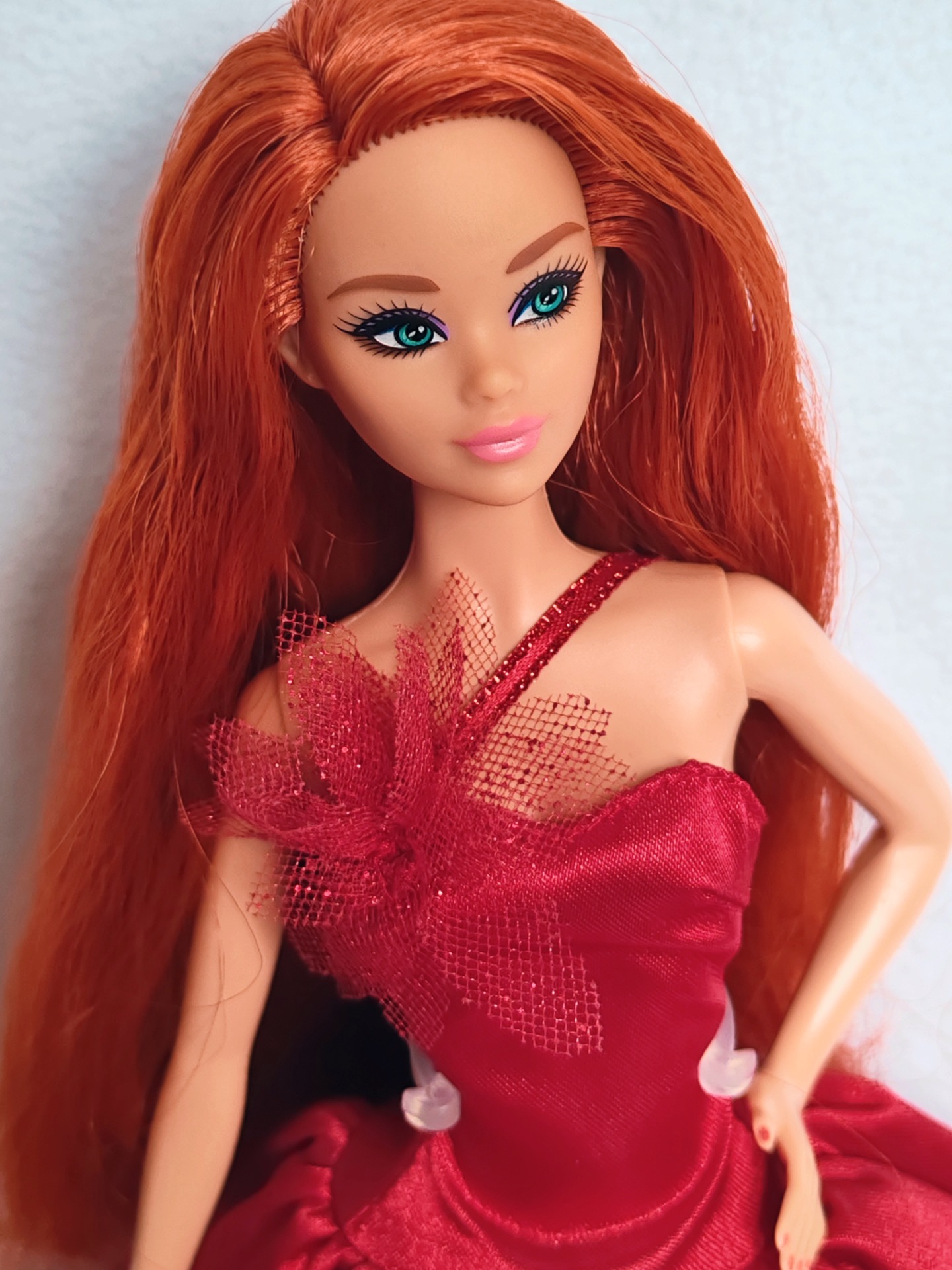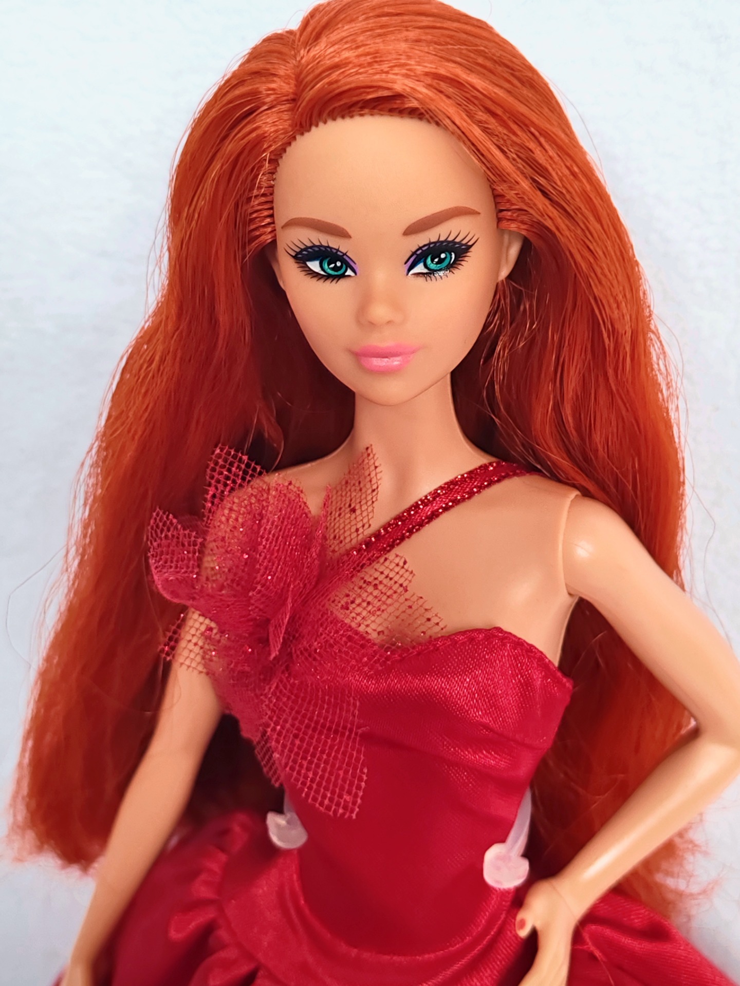 Narovnané vlasy, pouze vystavená ve vitríně. Vlasy jsou plně bez gelu či laku.