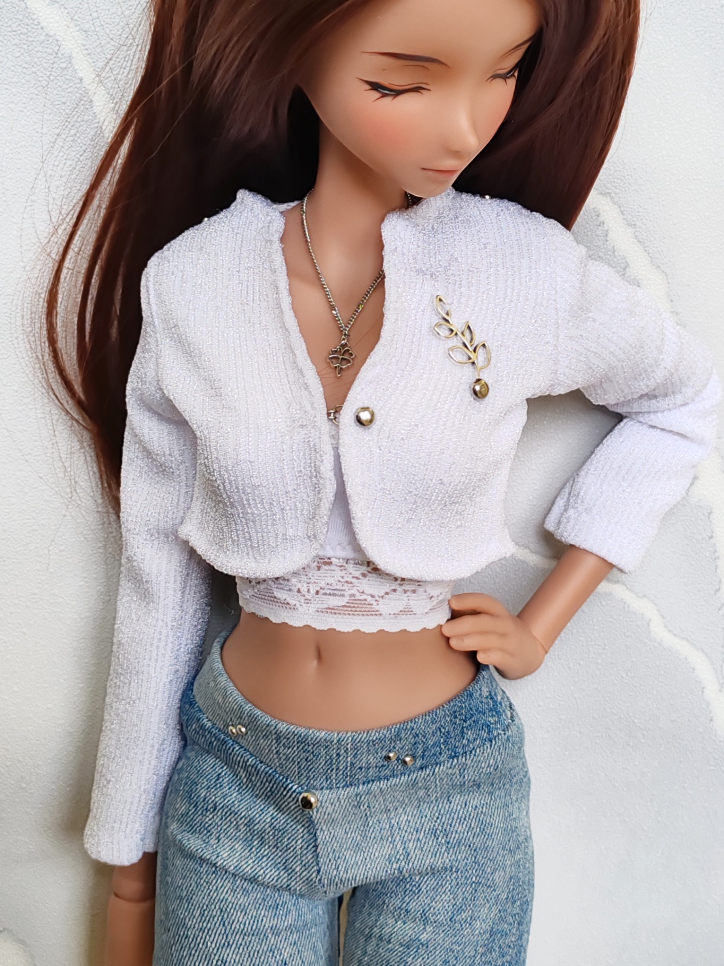 Bílé bolerko s kovovým zdobením, dlouhým rukávem pro panenky velikosti 60cm. (1:3)