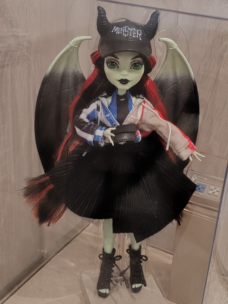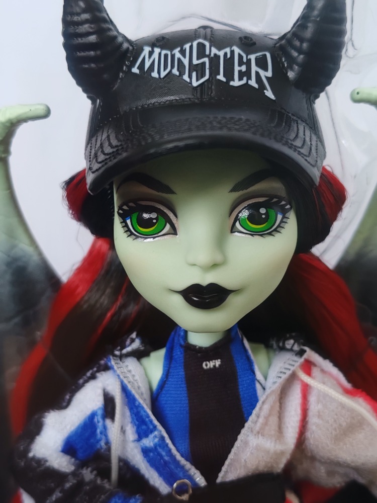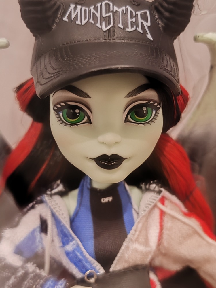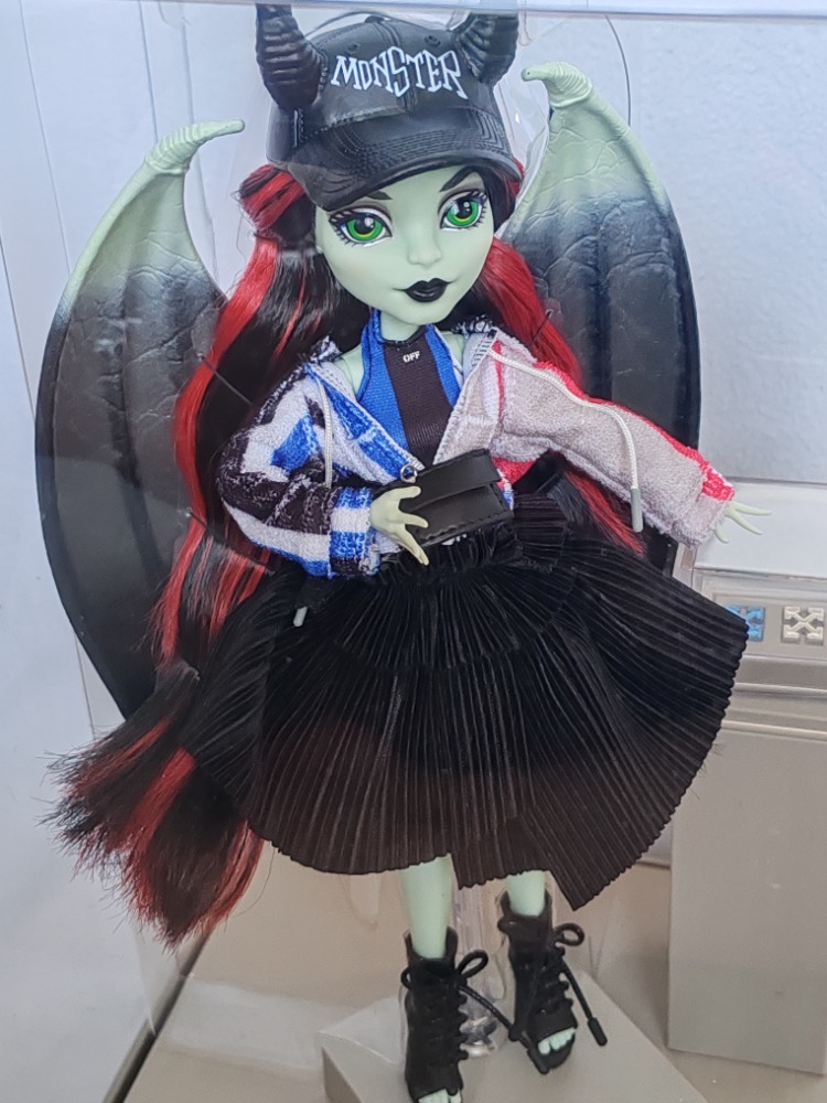 Naše třetí panenka, Raven Rhapsody, se nese v outfitu od značky Off-White™ inspirovaném kolekcí Off-White™ jaro/léto 2017. Tento outfit zahrnuje zkrácenou mikinu s kapucí v barevných blokech a černou kabelku na opasek, které doplňuje černá asymetrická plisovaná sukně, botičky s otevřenou špičkou a klobouk s nápisem "MONSTER".