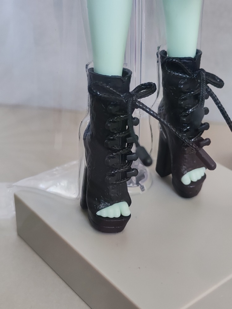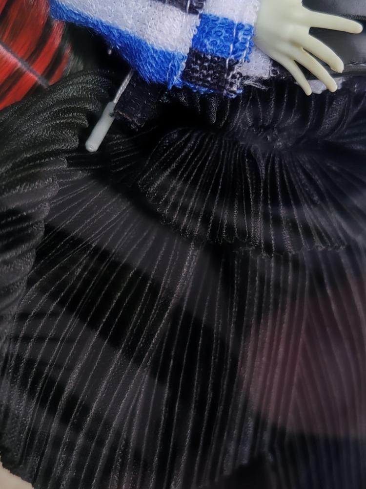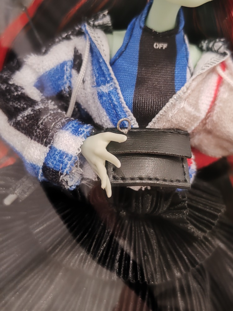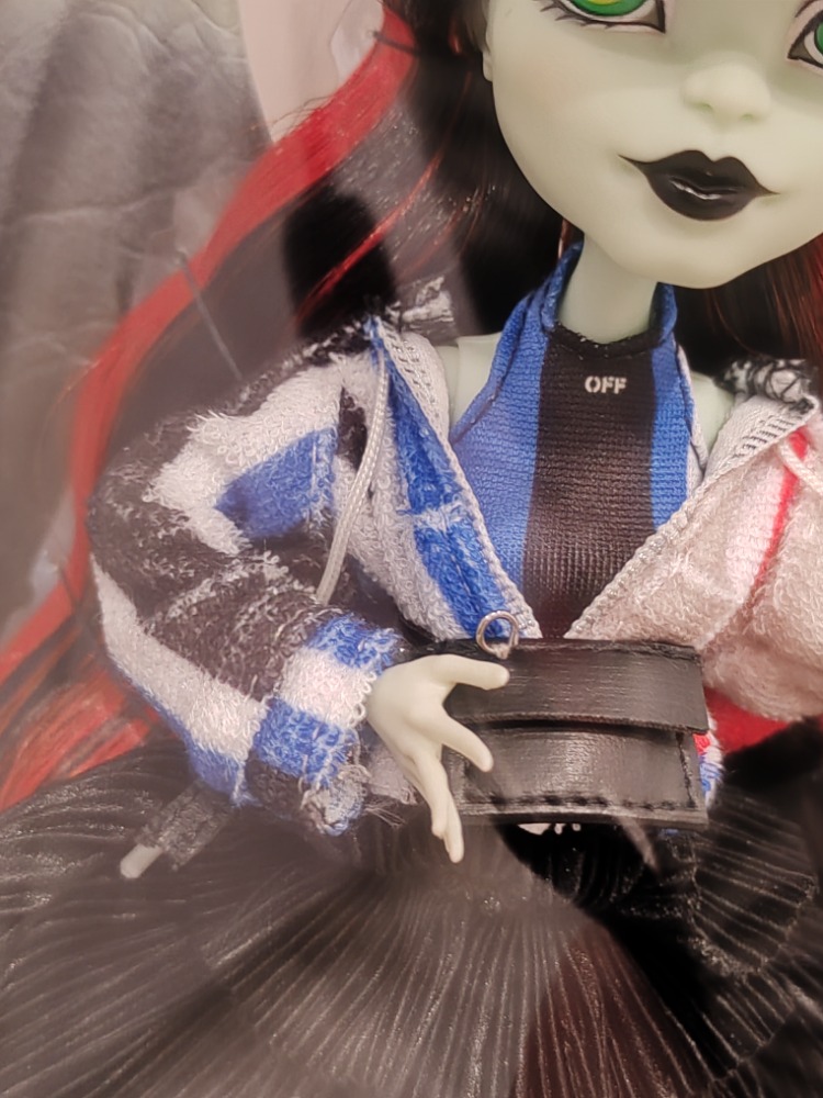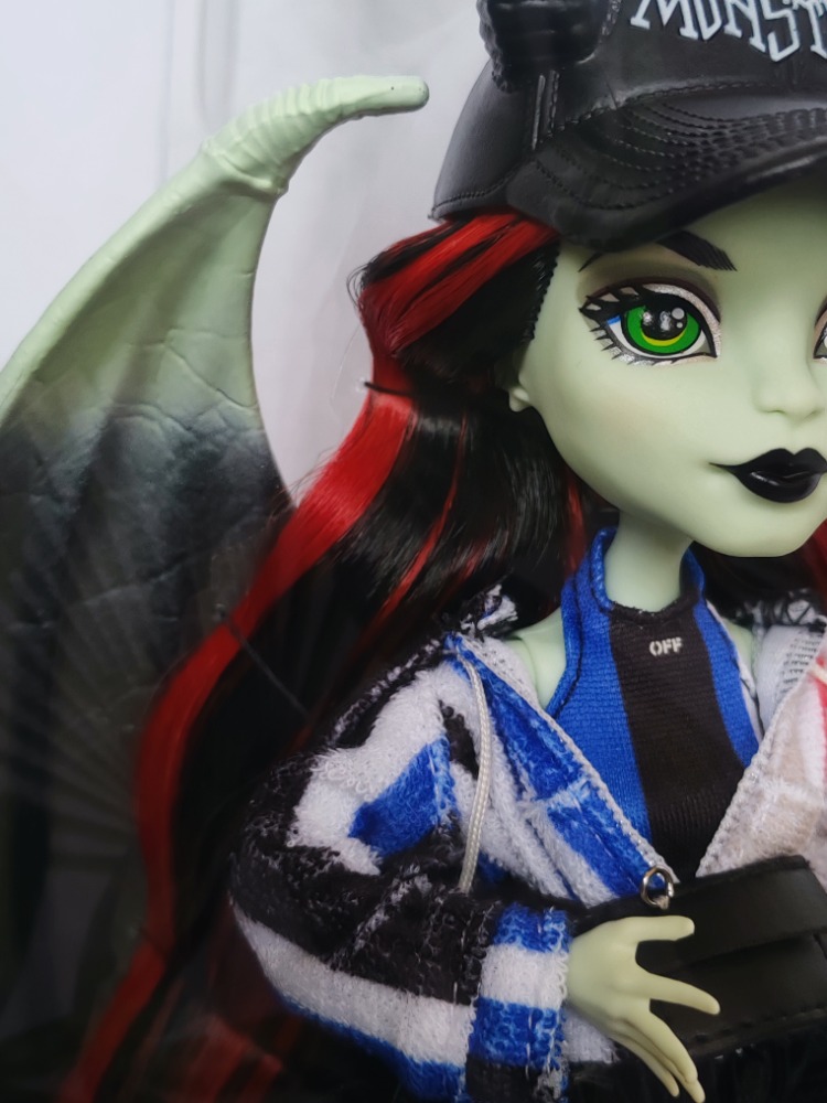 Naše třetí panenka, Raven Rhapsody, se nese v outfitu od značky Off-White™ inspirovaném kolekcí Off-White™ jaro/léto 2017. Tento outfit zahrnuje zkrácenou mikinu s kapucí v barevných blokech a černou kabelku na opasek, které doplňuje černá asymetrická plisovaná sukně, botičky s otevřenou špičkou a klobouk s nápisem "MONSTER".